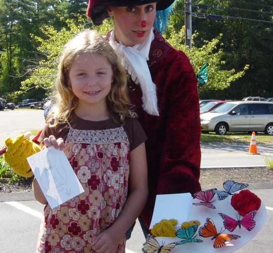A rainbow of butterflies dally on my palette as dabs of paint. Each splashy line I draw changes hue (thanks to a pencil filled with multi-colored lead!). In Lakeville, I have the honor of making the first-ever drawing of weeks-old infant Violet. Next, a young boy clutching his plastic pet dinosaur is awarded a triumphant sketch in which he rides his prehistoric steed. Next, with crafty delight, I capture the love I see in a couple's clasped hands. Picaso-so lahvs lahv! And Barbara loves Fall Festivals!